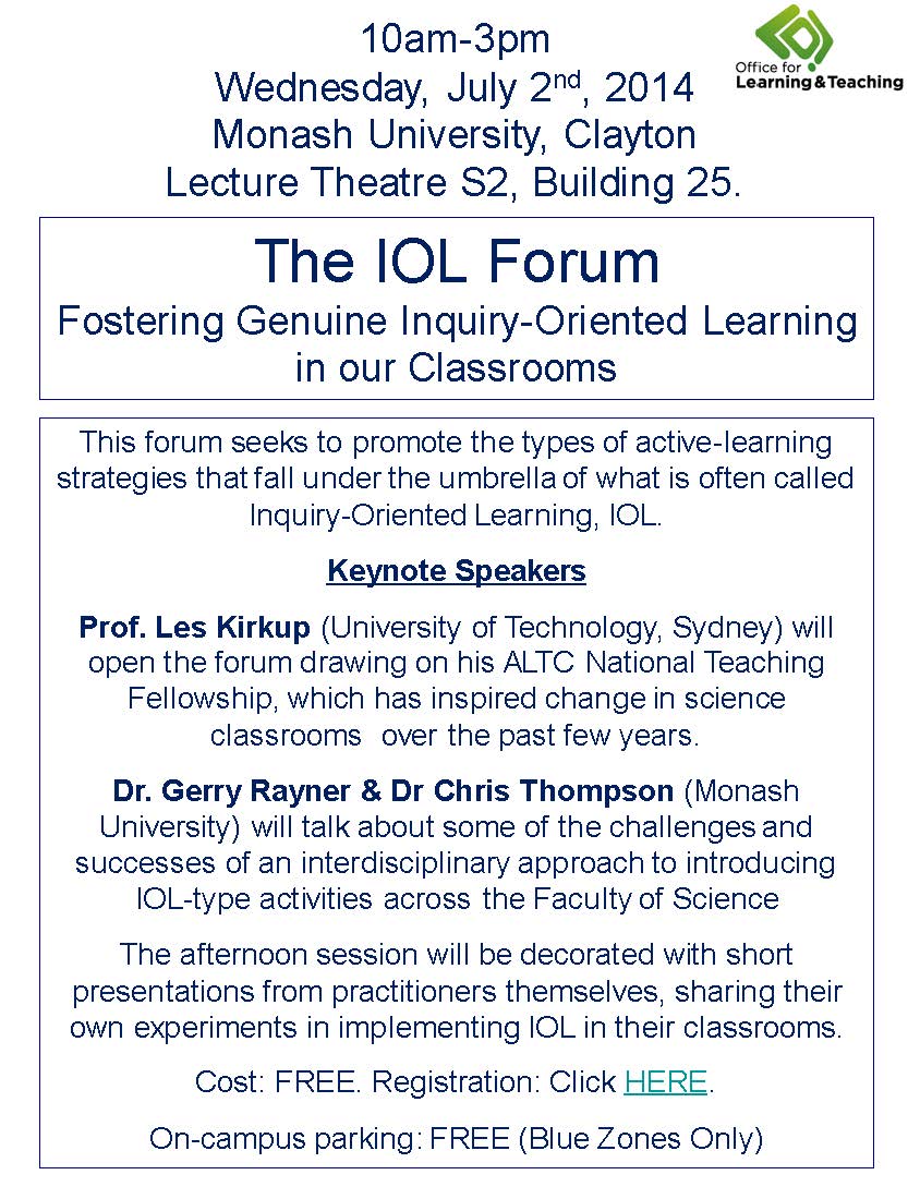 Posted on June 13, 2014 by VTAS Promoting Excellence NetworkThe IOL Forum – 2 July 2014 – Monash, Clayton Registrations here: https://docs.google.com/a/monash.edu/forms/d/1wUNWBdrhXVneJar-pQir4duKsxjiZiMZVxgu-ECXKeE/viewform Share this: Click to email a link to a friend (Opens in new window) Email Click to share on Facebook (Opens in new window) Facebook Click to share on X (Opens in new window) X Like Loading... Related
