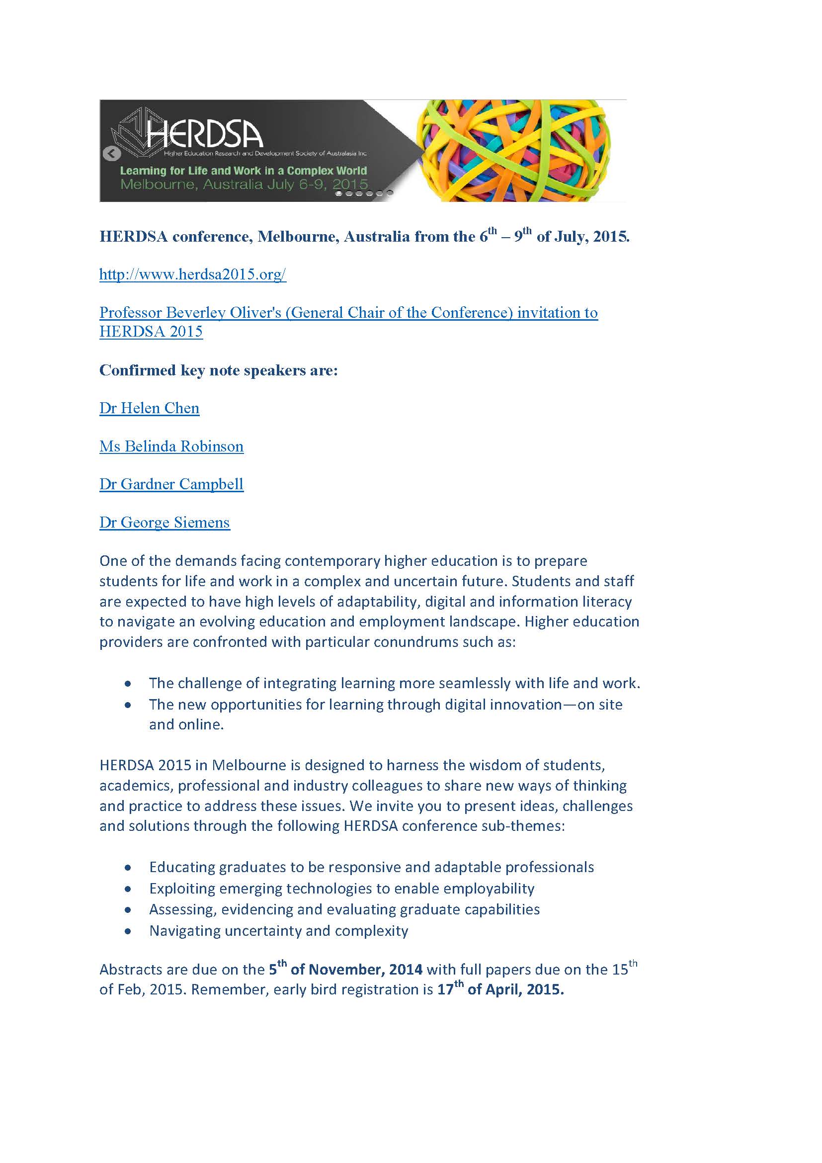 Posted on October 3, 2014 by VTAS Promoting Excellence NetworkHERDSA conference, Melbourne, Australia from the 6th – 9th of July, 2015. http://www.herdsa2015.org/ Share this: Click to email a link to a friend (Opens in new window) Email Click to share on Facebook (Opens in new window) Facebook Click to share on X (Opens in new window) X Like Loading... Related